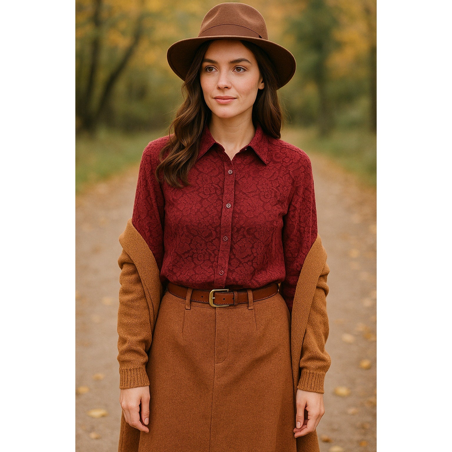 Elegant vintage Chaus & Co button-down blouse featuring a romantic burgundy floral lace design. Lightweight and semi-sheer with a collared neckline, button front, and feminine scalloped edges. Perfect for layering over a cami or styling under a blazer.